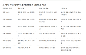 표 제목: 주요 컬러푸드별 영양성분과 건강효능 비교