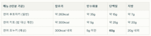 밥이 안 들어가니 탄수화물은 확 줄고 단백질 함량은 엄청나게 높을 거라는 건 굳이 계산해보지 않아도 알 수 있겠네요.